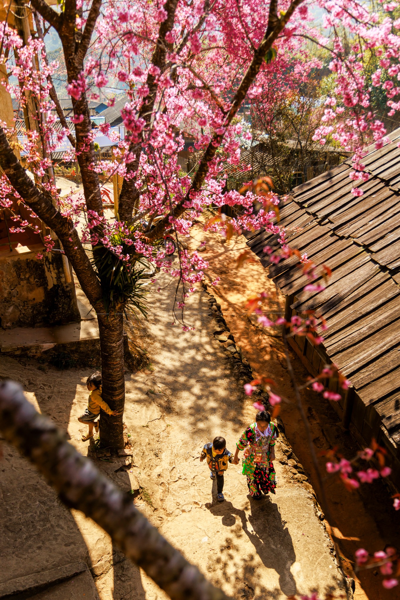 Village paths are lined with blooming cherry trees, creating a gentle, romantic atmosphere that feels untouched and authentic.